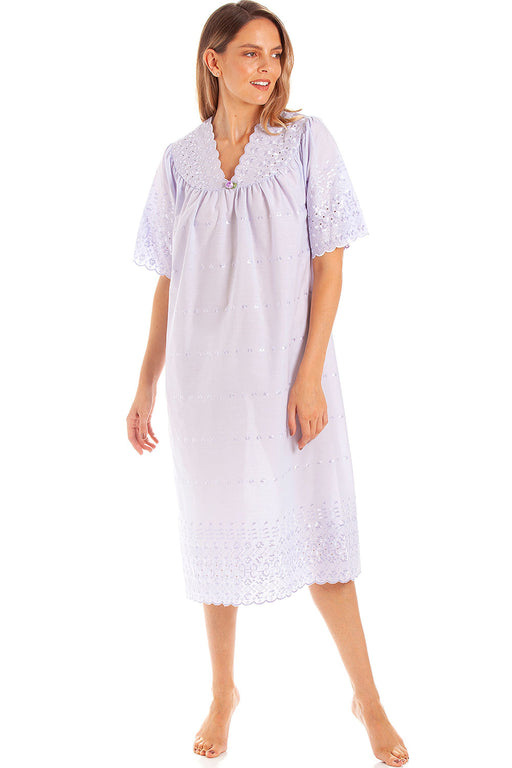 V neck nightdress with full button front and broderie anglaise pattern short sleeves with broderie anglaise trim covered full button fastening we...