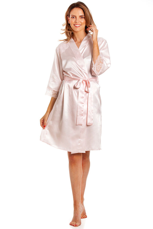 • British Made Long Satin Wrap Dressing Gown With Lace Trim