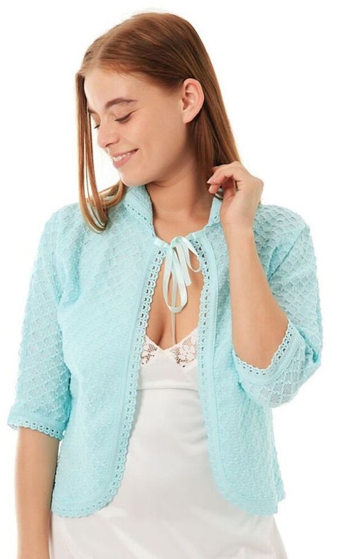 Lightweight Knitted Bed jacket Small Peter Pan collar Ribbon Tie fastening Pretty Crochet Edging to Front and Sleeves Material: 100% Acrylic Colo...