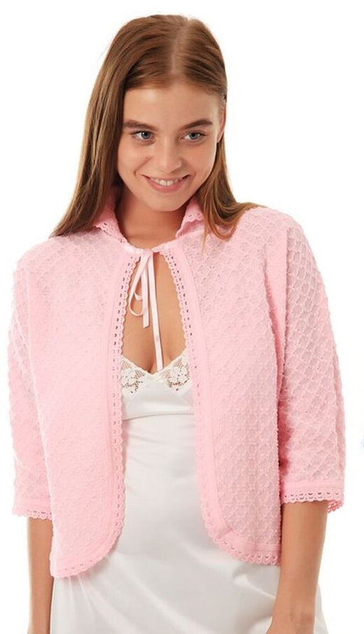 Lightweight Knitted Bed jacket Small Peter Pan collar Ribbon Tie fastening Pretty Crochet Edging to Front and Sleeves Material: 100% Acrylic Colo...