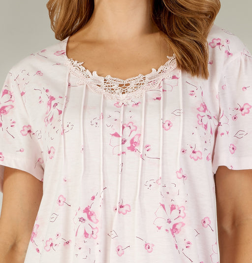 Sleeveless Floral Nightdress Pintuck Detail to the Yolk with Satin Edging Easy Care Cotton Jersey Material Cream With Pink, Blue or Lilac Print Le...