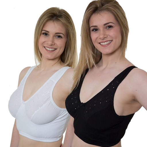 Soft Deep Cotton Pull on Bra with Pretty Broderie Anglaise Cups Wide Shoulders Ideal Sleep and Comfort Bra Light Support Colours: White, Black Si...
