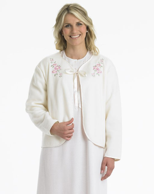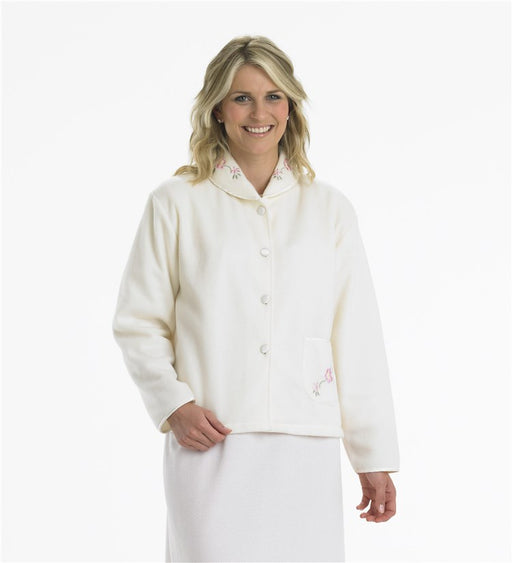 Keep warm and cozy with our elegant Slenderella Polar Fleece Anti Pill Tie Front Bed Jacket. Featuring a classic round neck line and delicate flora...