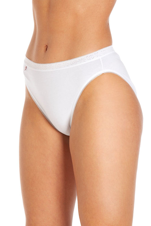 Smooth cotton and lycra midi brief made in the UK high cut leg wide lace trim round the waistband double lined cotton gusset sold in packs of 3 ma...